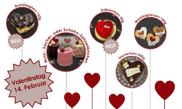 NEU Brandteigherz 130g, NEU Erdbeerherz 50g, Mürbteigherzen 100g, Sacherherz 500 g, Nuss-, Sacher- oder Schoko-Sahnetörtchen